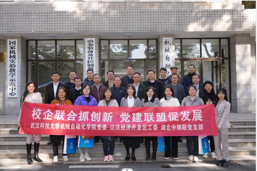 湖北中鋼聯(lián)冶金工程有限公司是江漢創(chuàng)谷文化與科技融合示范集聚區(qū)優(yōu)秀民營(yíng)企業(yè),也是黨建聯(lián)盟輪值主席單位。為加強(qiáng)基層黨建工作的交流與探索,提升黨建引領(lǐng),促進(jìn)企業(yè)高質(zhì)量發(fā)展。12 月 7 日,中鋼聯(lián)黨支部組織在寶武鋼鐵有限公司和武漢 科技大學(xué)機(jī)械學(xué)院開展“校企聯(lián)合抓創(chuàng)新,黨建聯(lián)盟促發(fā)展”黨建聯(lián)盟活動(dòng),江漢經(jīng)濟(jì)開發(fā)區(qū)工委副書記戴瑩、江漢經(jīng)濟(jì)開發(fā)區(qū)管委會(huì)副主任艾亮、江漢經(jīng)濟(jì)開發(fā)區(qū)“兩新”黨建指導(dǎo)員洪修平、趙挺松、潘曉光、武漢科技大學(xué)機(jī)械自動(dòng)化學(xué)院黨委副書記瞿孝平、機(jī)械自動(dòng)化學(xué)院副院長(zhǎng)王蕾、中鋼聯(lián)總經(jīng)理何雙林、中鋼聯(lián)黨支部副書記朱聰、江漢創(chuàng)谷文化與科技融合示范集聚區(qū)黨建聯(lián)盟單位代表等共 30 余人參加了此次活動(dòng),并圓滿舉行。