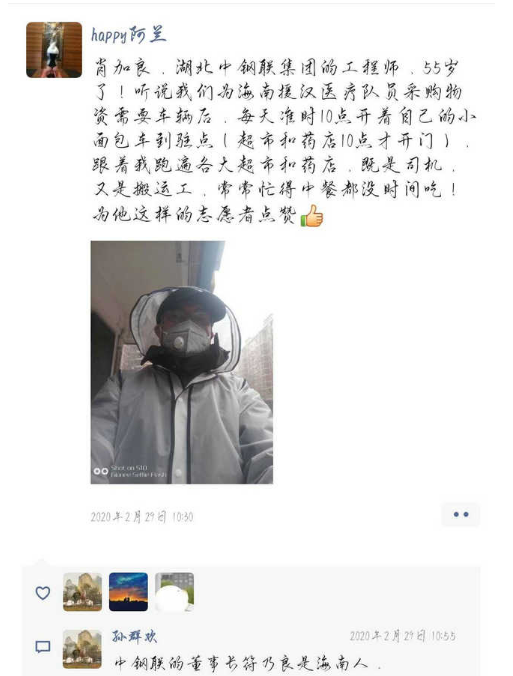 肖加良,湖北中鋼聯(lián)機(jī)械制造廠廠長,在公司算比較年長,已經(jīng)55歲了,聽說區(qū)工商聯(lián)組織人員保障海南省援漢醫(yī)療隊,保障隊缺司機(jī)和車輛,他二話不說就帶車加入保障隊伍,從2月5日開始一直到上周,每天開著自己的面包車輾轉(zhuǎn)各大超市、藥店和醫(yī)療隊駐地,既當(dāng)司機(jī)又當(dāng)搬運工,有時候忙的飯都顧不上吃,還要時刻做好防護(hù)和消毒工作,我們要為他的行為點贊。